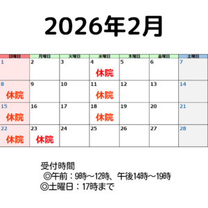 お気軽にお問い合わせください。096-353-5525受付時間 平日:9:00~12:00、14:00~19:00 土曜:9:00~12:00、14:00~16:30 ※水、日曜休診(祝日がある週は、祝日休診、水曜診療)